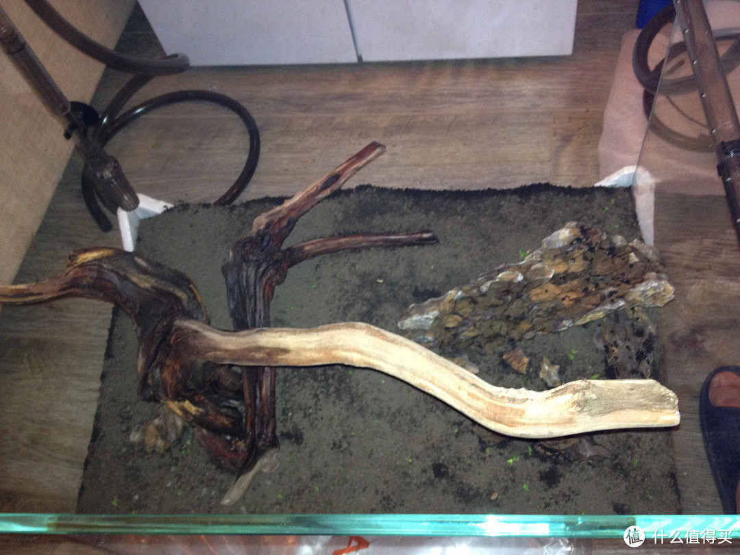 四、造景:把沉木、石头这些造景元素按照构思的想法布置到缸里,调整位置,然后对底泥的造型再微调(高低、脉络走向),达到理想的高度和倾斜度。接着,把三角慕丝这样的须状植物用黑线捆绑到沉木的树枝上,这样原本光秃秃的沉木就变得生机盎然,慕丝也可以附着在沉木上生长。